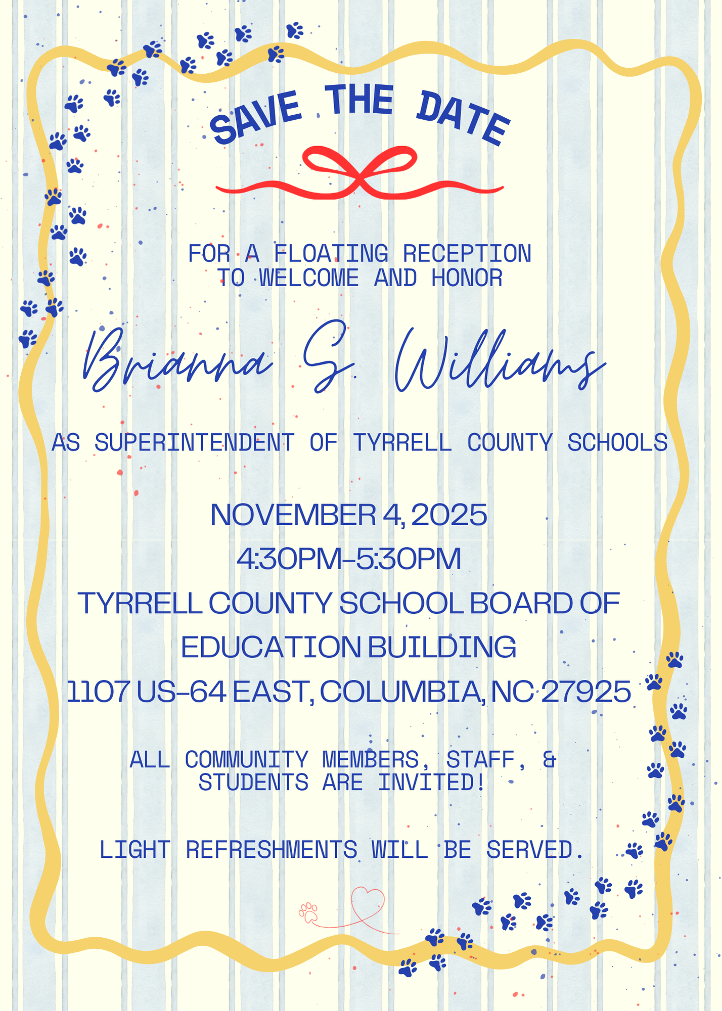 Tyrrell County Schools invites all community members, staff, and students to a Floating Reception honoring our new Superintendent, Ms. Williams!
